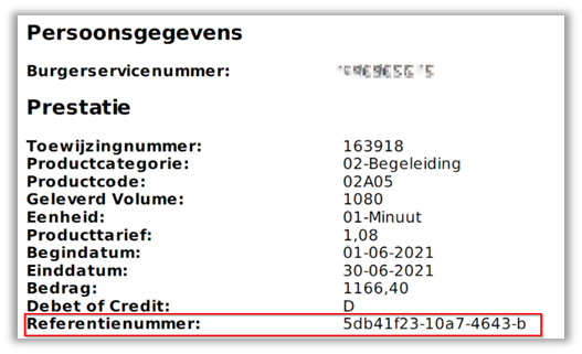 Vul in het excelbestand in de kolom 'credit referentienummer', bij elke te crediteren regel, het referentienummer in dat vermeld is in de PDF van de origineel ingediende debet (323) bij deze cliënt-product combinatie. Bijvoorbeeld: “Referentienummer: a1d8786a-35fa-4ace-a”. Deze bestaat uit letters, cijfers en streepjes. Het referentienummer neem je in zijn geheel over, ook de streepjes. Controleer dat er geen spaties voor of na het nummer mee gekopieerd worden. Dit leidt tot afkeur!